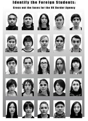 Two visual questionnaires were developed in response to the current (i.e., in the academic year 2012–13) escalation of the UK government’s requirement for universities to monitor and report on the attendance of their foreign national students to the immigration services. As interventions, the purpose of the surveys was to interrupt the (daily) production and embodiment of discrimination that structures the University. Forty-five ‘home’ (UK) students at Central Saint Martins College of Art and Design were approached to complete the surveys. The questionnaires presented the interviewees with the dilemma of discrimination and prompted reflection on the logics exposed in the act of identifying a ‘foreign’ student. As a whole, the project explores the affective experience and ethical implications of partaking in an act of decision-making and determining who does and does not 'belong'.