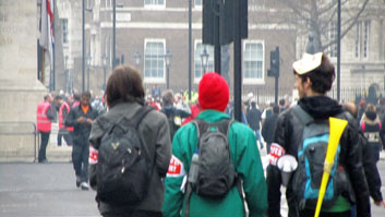 Members of the Hacktivist Organisation, Anonymous, wearing Citizen Artist Armbands at the TUC Rally, March 26, 2011.