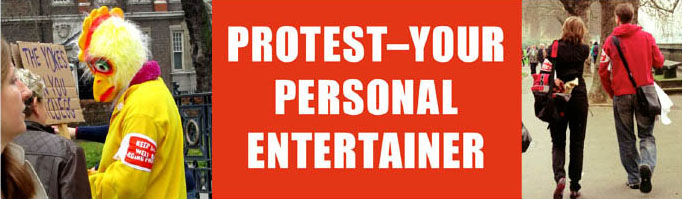 One hundred and twenty protest slogans were generated by an online 'sloganizer'. The online software combined movie tag lines and commercial promotional phrases with the key word 'Protest' resulting in a vast array of hideous but amusing new slogans. In handing out the armbands, we were in essence playing a double game; parodying protest slogans at the same time as supporting the cause and participating in the march.