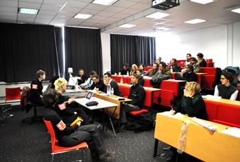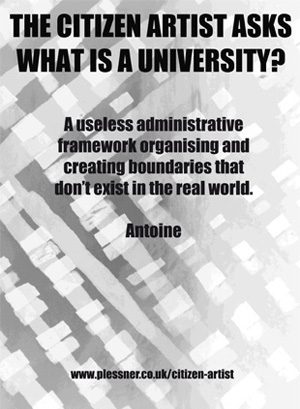 The Citizen Artist team participated in a workshop with members of Goldsmiths College and Sciences Po Ecole des Arts Politiques (SPEAP). The theme for discussion was 'Militant Research'. Instead of responding to the topic as a point of conversation, the Citizen Artists embraced the opportunity to not only parody the idea of militancy but to provoke members of the group of researchers to respond to the question of 'What is a University?' Who better to ask such a problematic question of than its members? The question was framed by a trenchant outline of the problem and after soliciting responses from the specialists, the team collated the research and within an hour of the session ending, published the results as posters which were then distributed around Goldsmiths college.