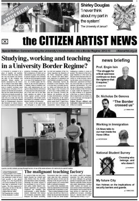 This special edition newspaper (available for download below) commemorates the transformation of the university into a border regime in the United Kingdom. It problematizes the notion of a University as a place of equality and mobility and shows how, inside the system, identities vary and barriers and boundaries exist. Commencing in the academic year of 2012-13 especially, foreign students in the U.K. are heavily monitored by universities on behalf of the Home Office, the costs of fees point up the differences in students’ economic status and the spaces and places of an institution are discrete and securitized. The aim of this newspaper was to capture aspects of the aesthetic and affective dimension of the university in transition.