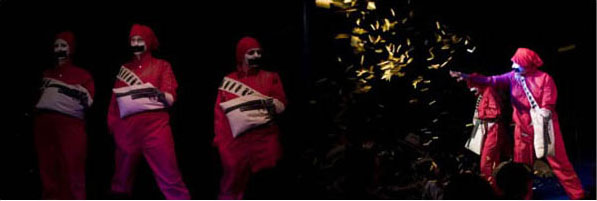 Putting On is an artists' collective that explores the representation and revolutionary potential of humour in the context of the clown, not only in his age-old role as a masquerading fool, a trickster, a joker and jester but as an aesthetic, social and political metaphor. The collective have pursued a range of projects including performing a "Gagged Gag' (as pictured here) at the Circus Charivari in Berlin (2010). They have also published work such as a pirated book for 'And, Press' as part of the publishing house's Piracy Project (2011) and broadcast a radio performance of their 'Manifesto' on Resonance fm (2011).
